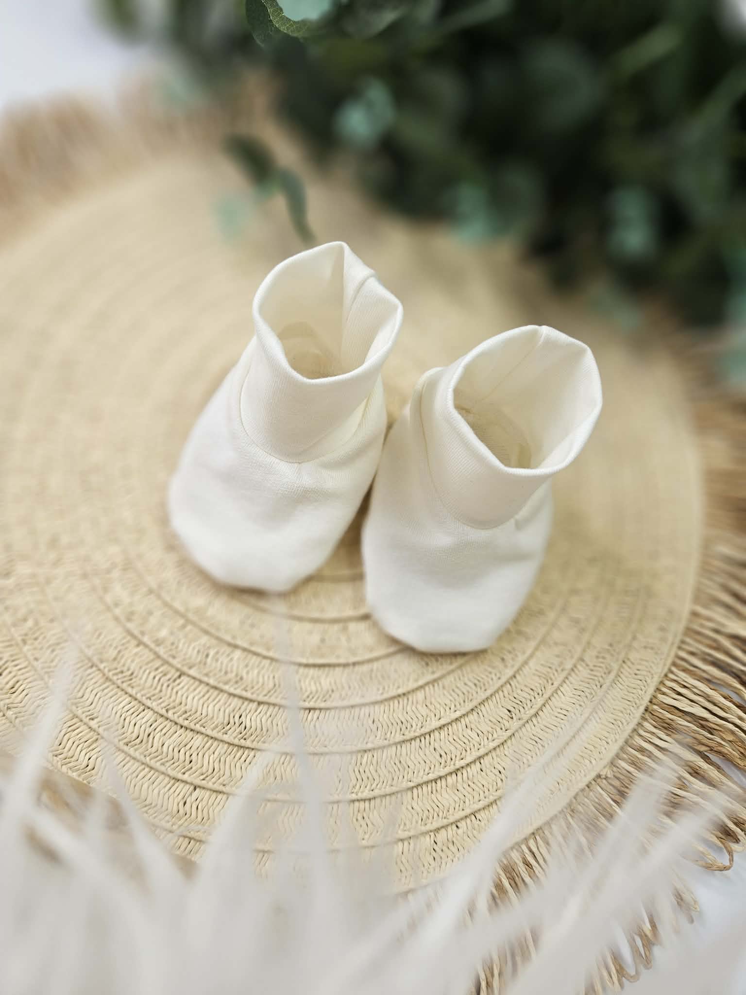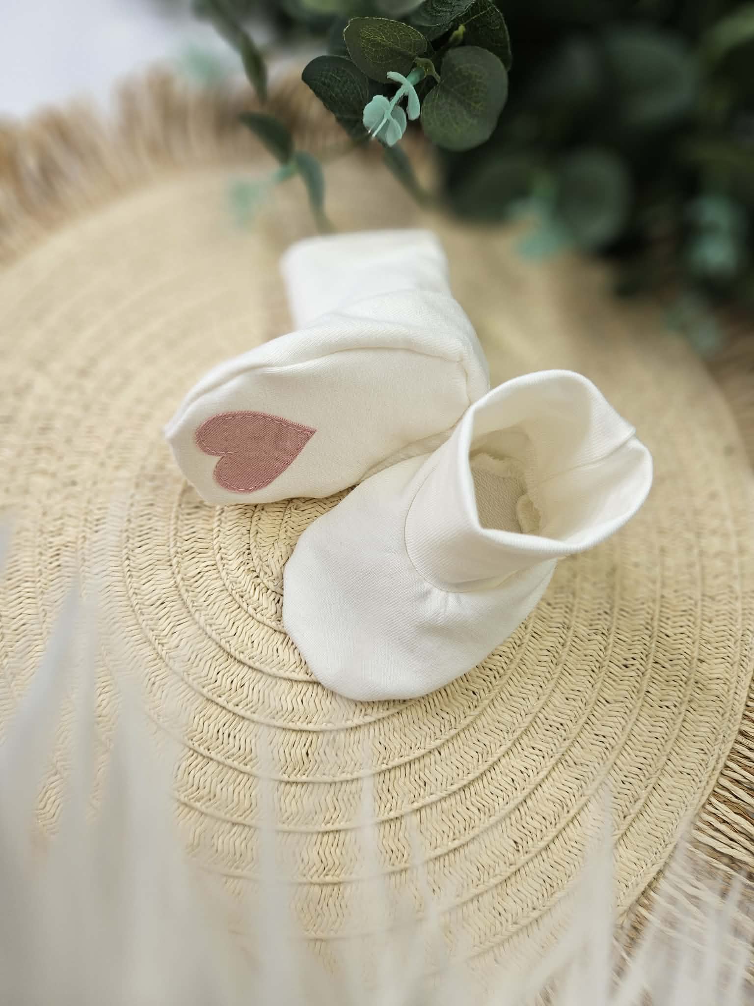 Šivani copatki v krem barvi, s prikupno šivano aplikacijo srca na podplatu.