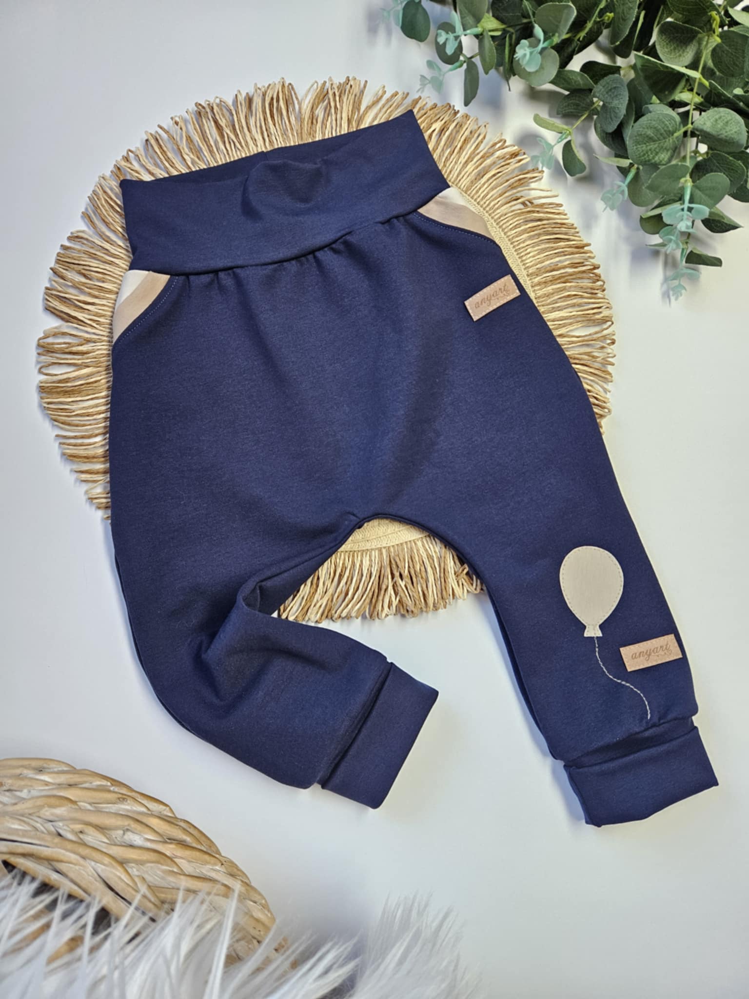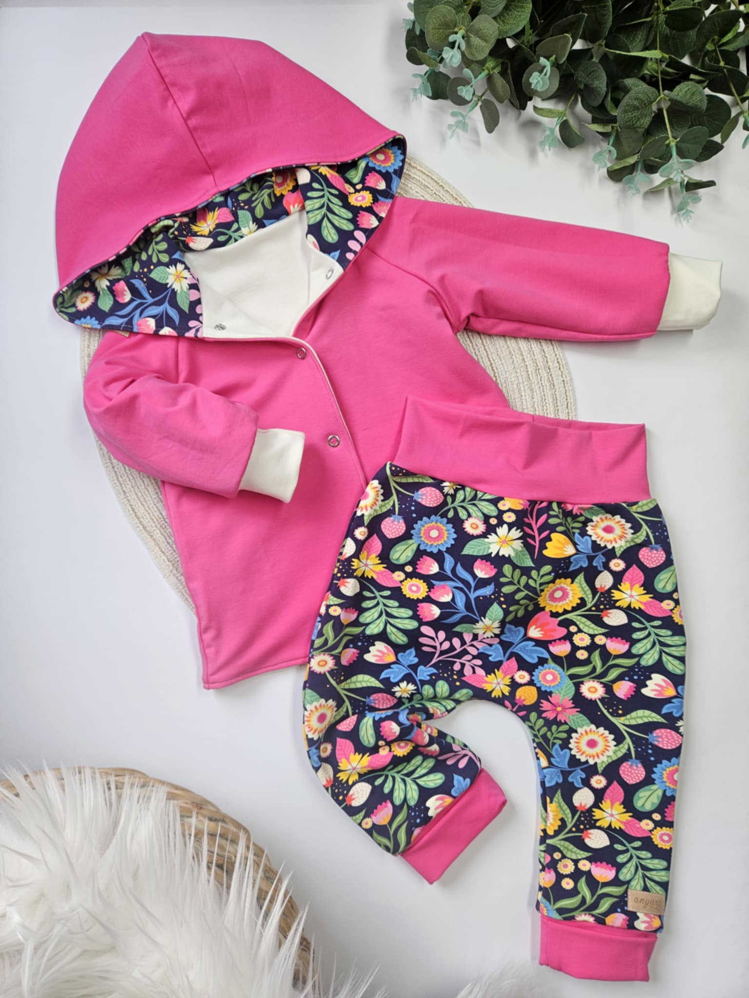 Komplet velikosti 80; vsebuje dvoslojno jopico s kapuco in z ročno izdelano aplikacijo na hrbtni strani, ter mehke baggy hlačke s podaljšanimi patenti za daljše nošenje. Osnova hlačk je temno modra.