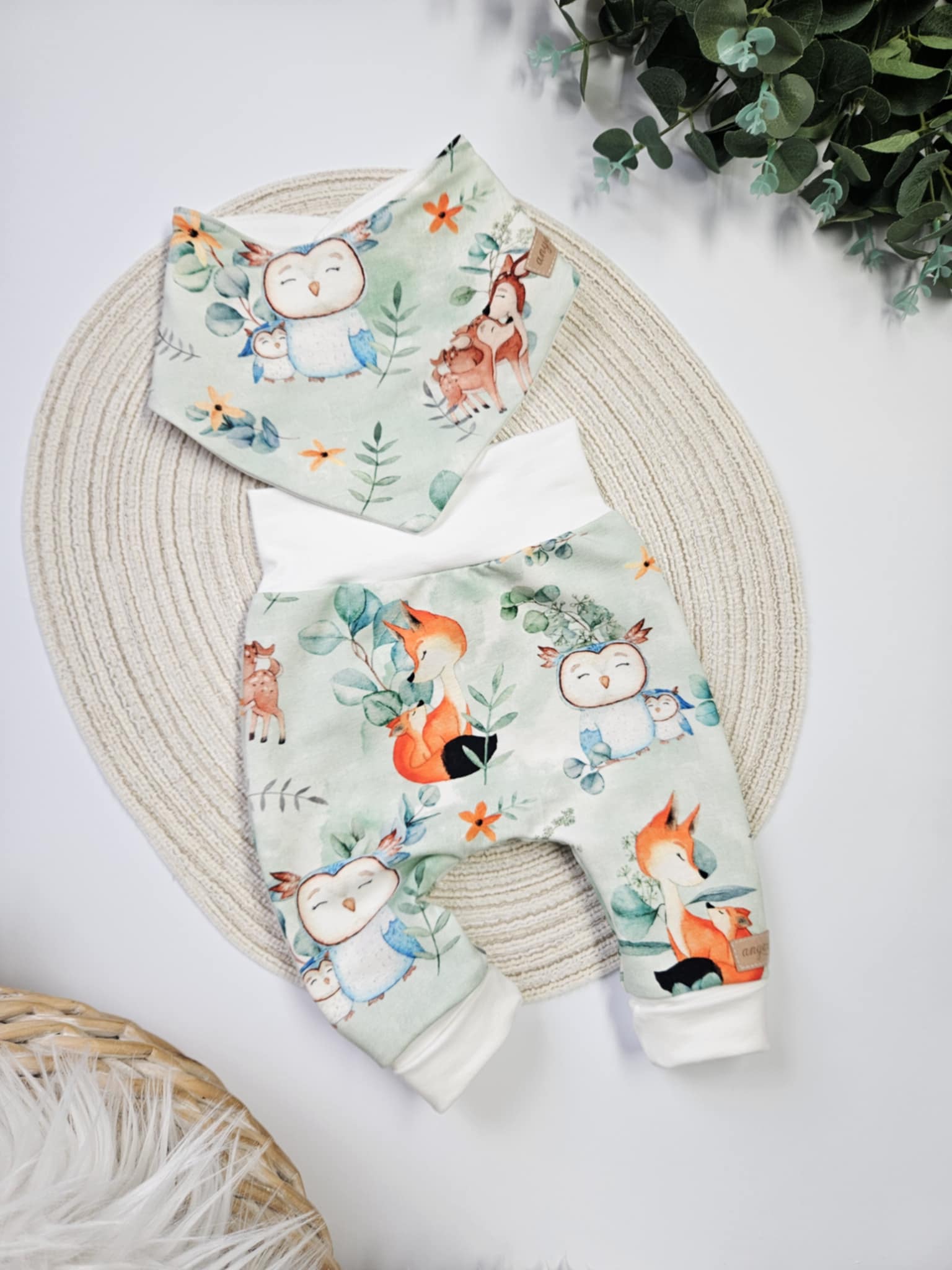 Komplet velikosti 62; vsebuje udobne baggy hlačke s podaljšanimi patenti za daljše nošenje, ter nastavljivo rutko/slinček.