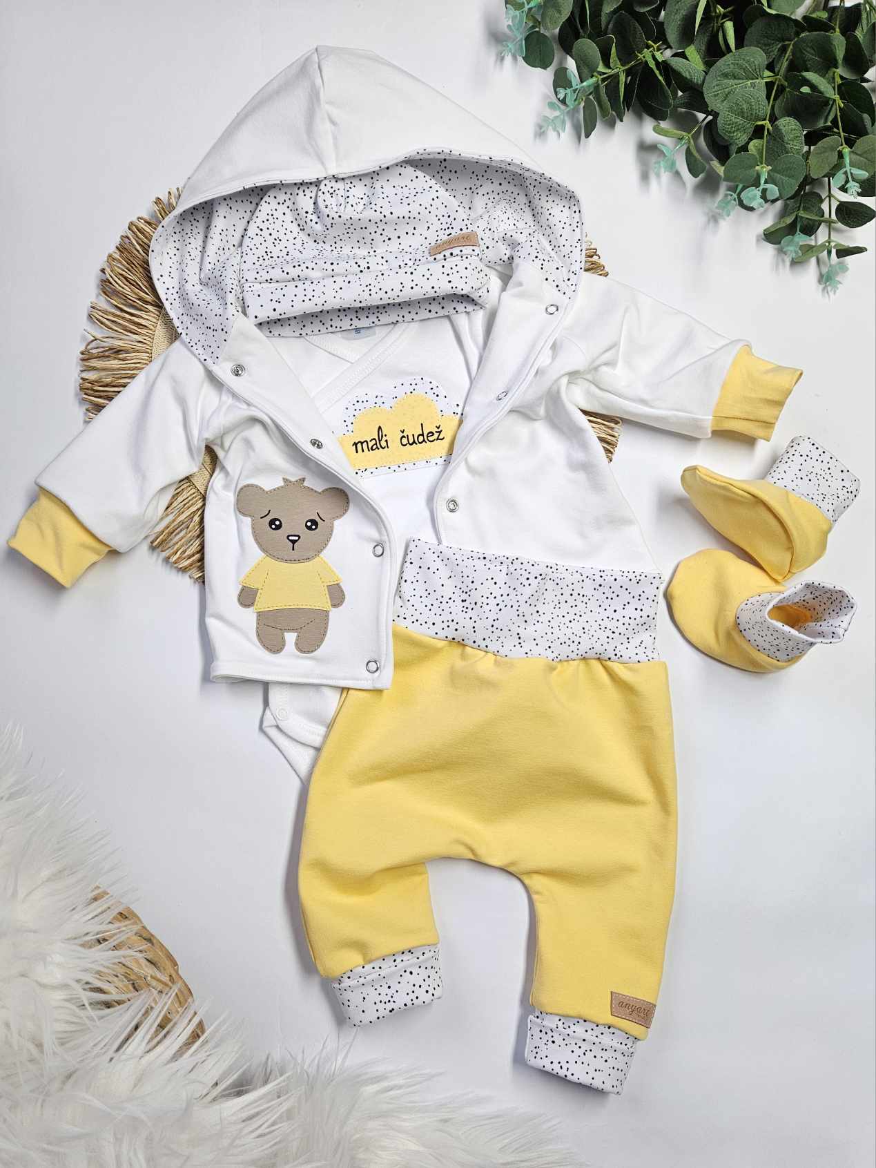 Komplet vsebuje dvoslojno jopico s kapuco in ročno izdelano aplikacijo, bodi (na preklop do št. 68) z aplikacijo in ročno naslikanim napisom, baggy hlačke s podaljšanimi patenti, copatke in kapico z vozli.