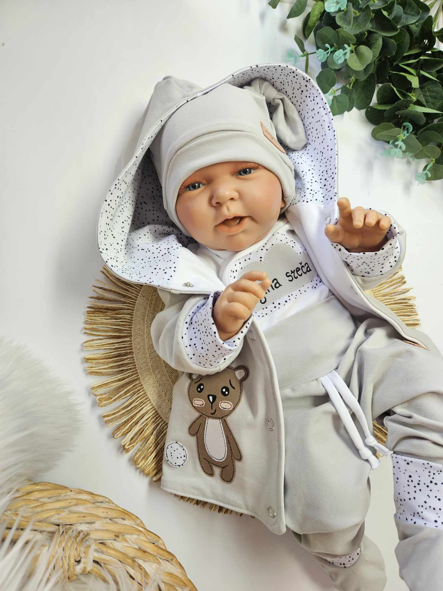 Komplet vsebuje dvoslojno jopico s kapuco in ročno izdelano aplikacijo, bodi (na preklop do št. 68) z aplikacijo in ročno naslikanim napisom, baggy hlačke s podaljšanimi patenti, copatke in kapico z vozli.