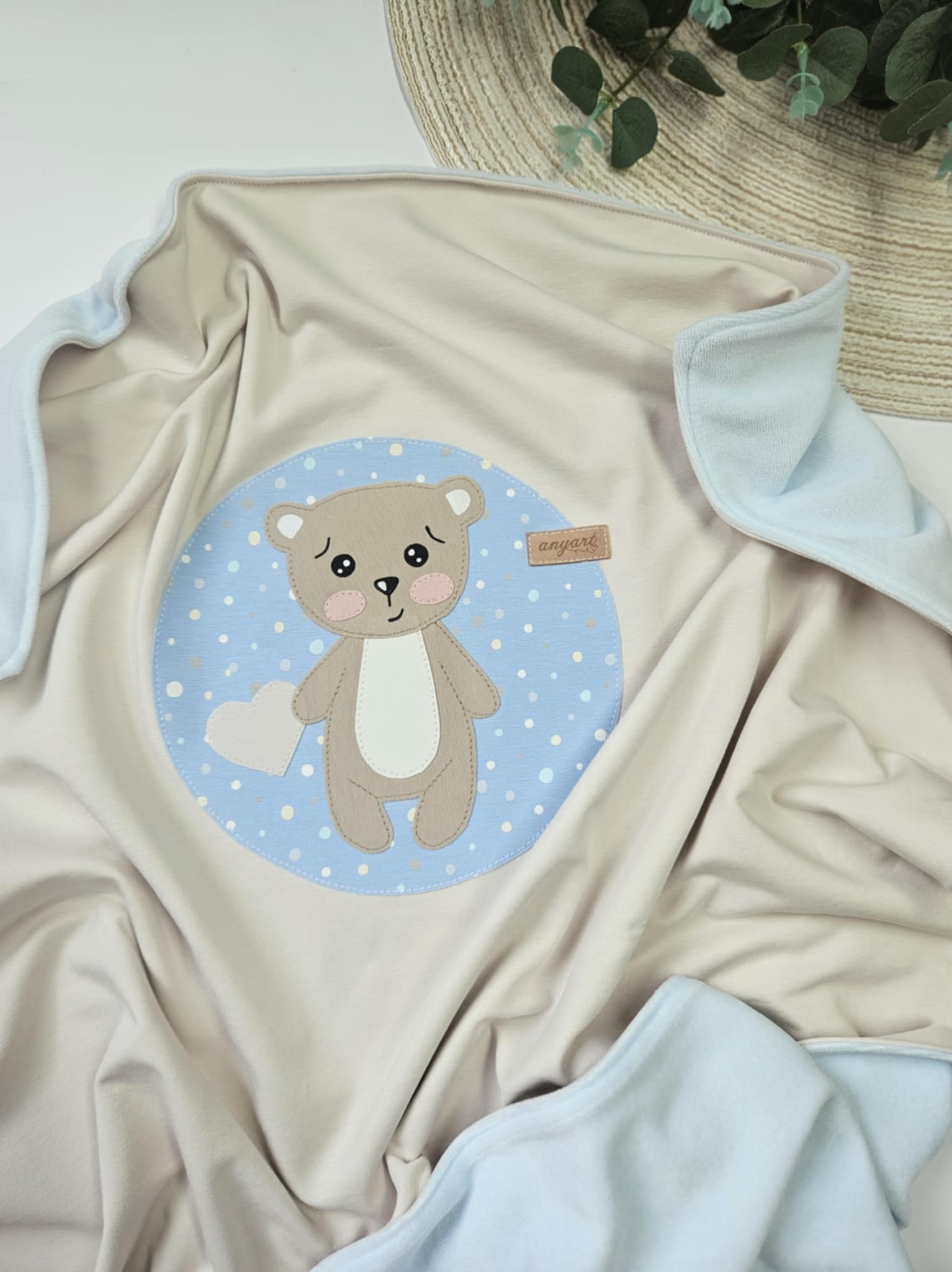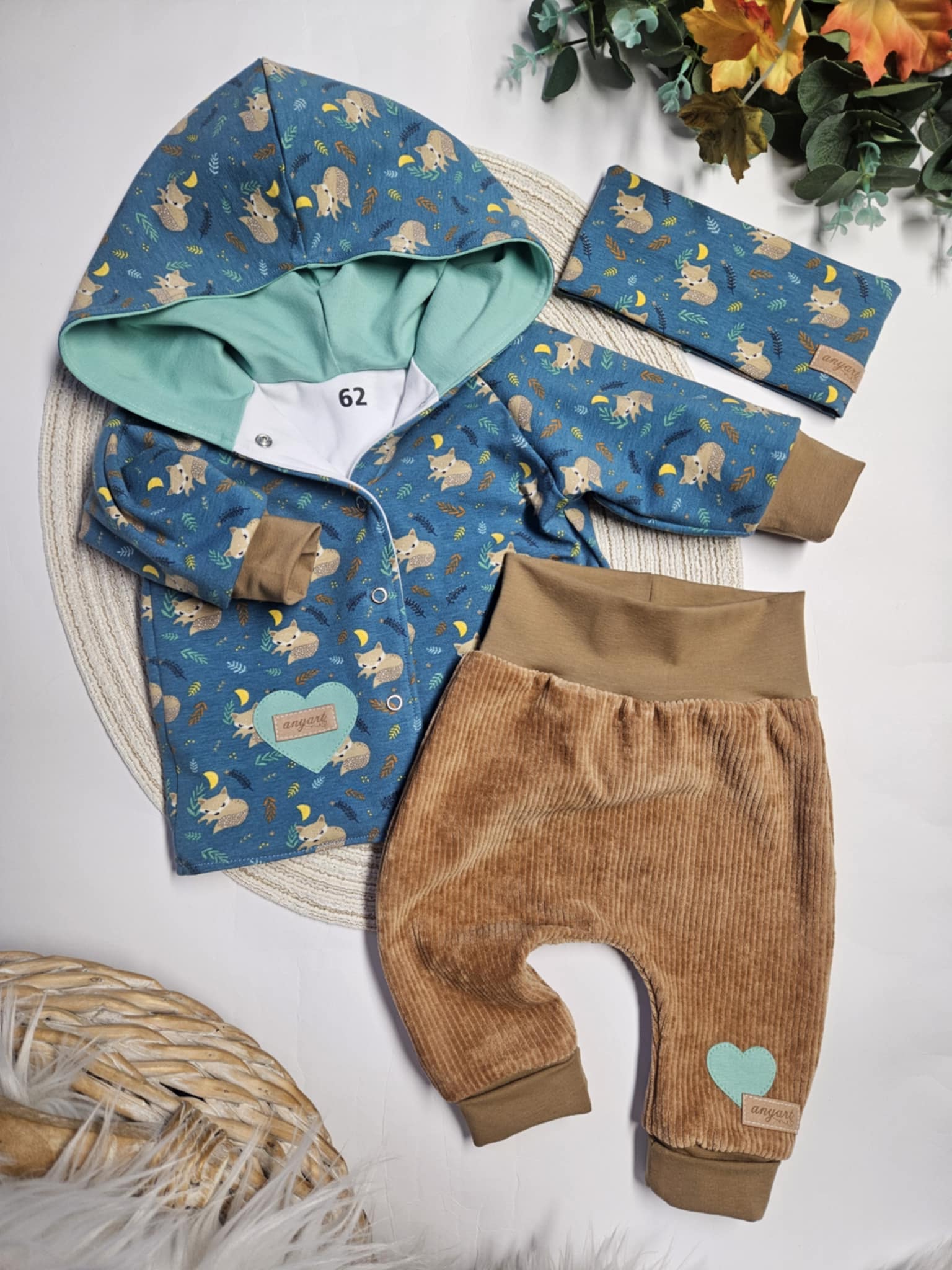 Komplet velikosti 62; vsebuje dvoslojno jopico s kapuco, tople žamet baggy hlačke s podaljšanimi patenti, ter trak.