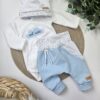 Komplet vsebuje dvoslojno jopico s kapuco in ročno izdelano aplikacijo, bodi (na preklop do št. 68) z aplikacijo in ročno naslikanim napisom, baggy hlačke s podaljšanimi patenti, copatke in kapico z vozli.