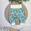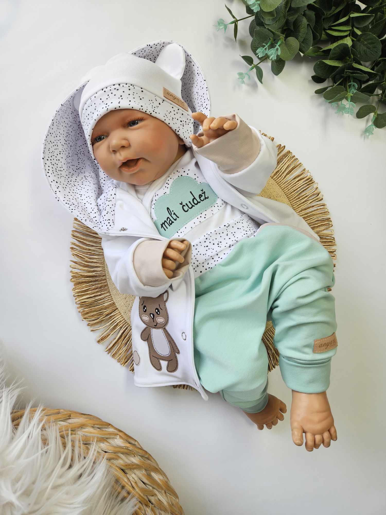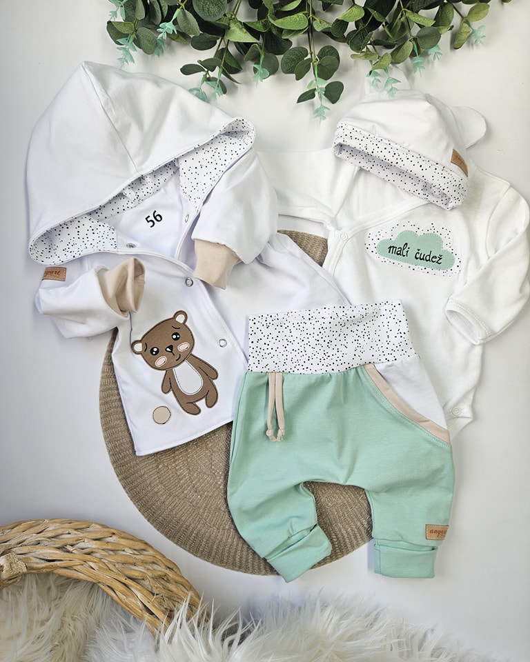Komplet vsebuje dvoslojno jopico s kapuco in ročno izdelano aplikacijo, bodi (na preklop do št. 68) z aplikacijo in ročno naslikanim napisom, baggy hlačke s podaljšanimi patenti, ter kapico z ušeski.