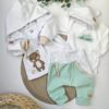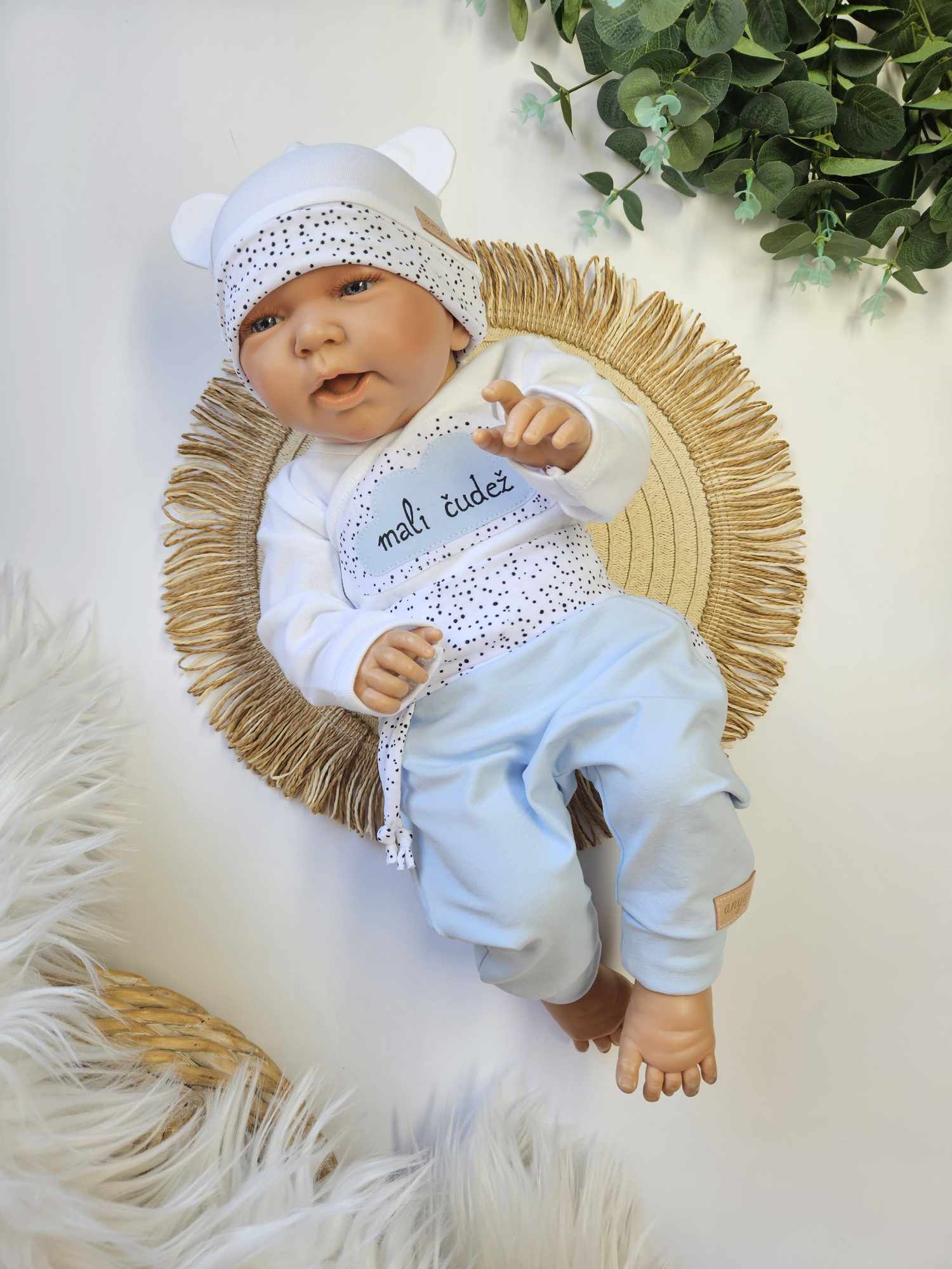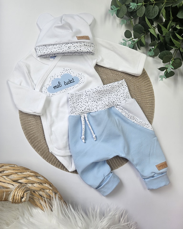 Komplet vsebuje bodi (na preklop do št. 68) z ročno izdelano aplikacijo in prikupnim napisom; baggy hlačke s podaljšanimi patenti za daljše nošenje, ter kapico z ušeski.