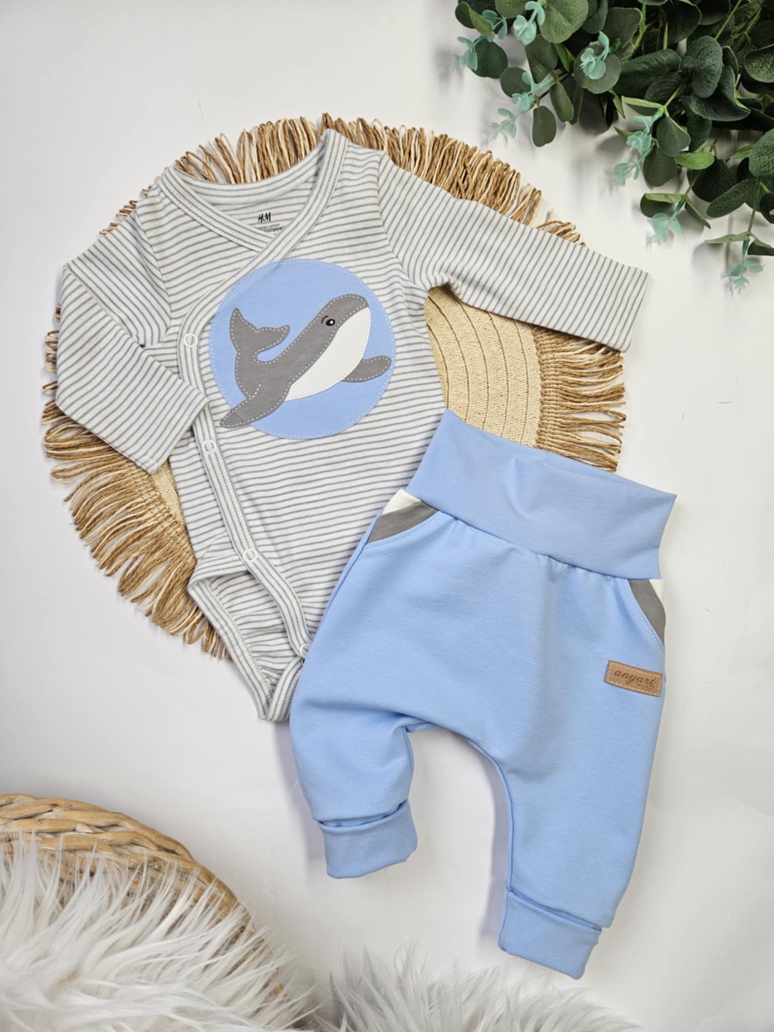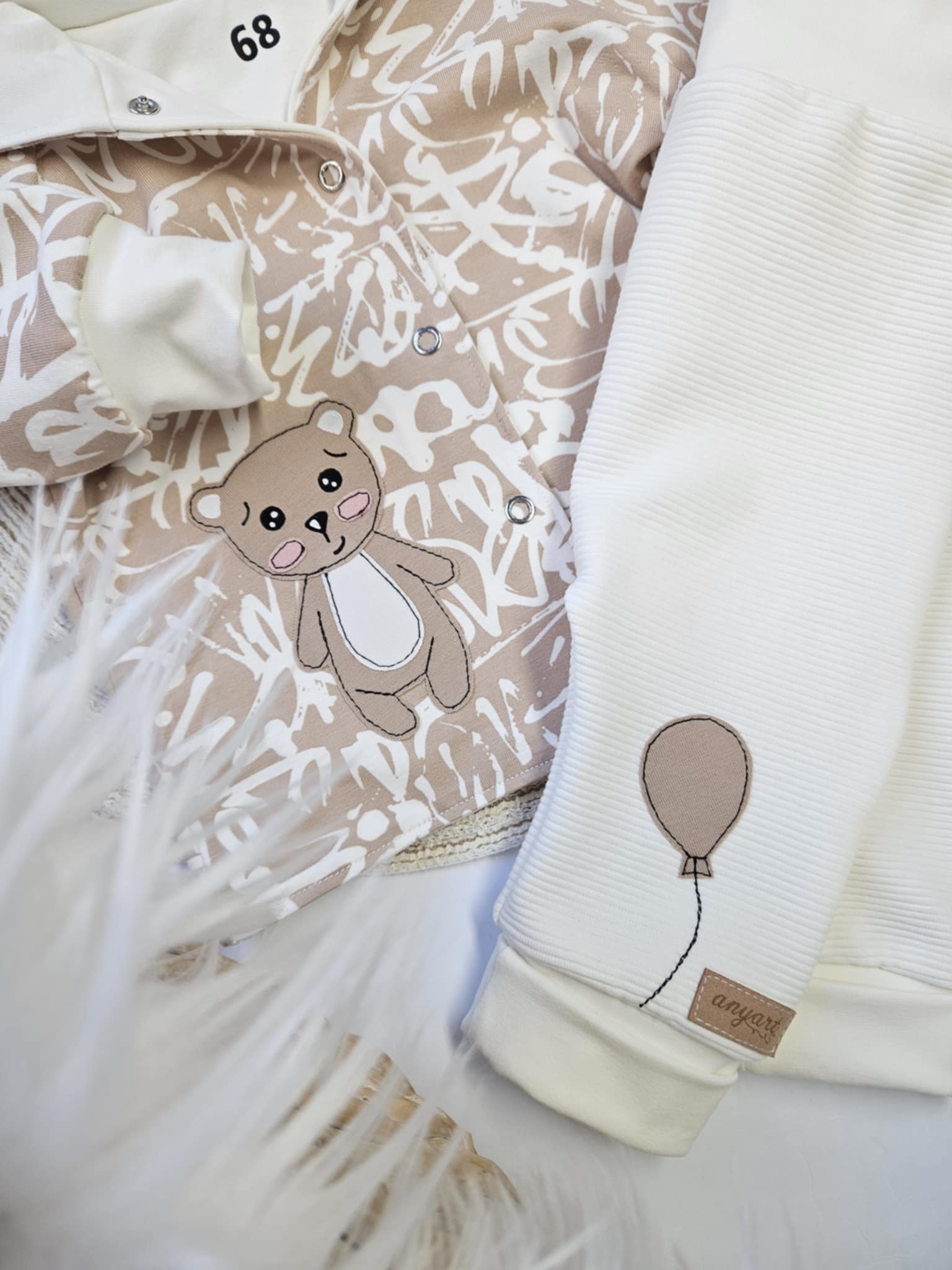 Komplet velikosti 68; vsebuje dvoslojno jopico s kapuco in ročno izdelano aplikacijo, tople rebraste baggy hlačke s podaljšanimi patenti, ter kapico z ušeski. Hlačke imajo prav tako ročno izdelano aplikacijo.