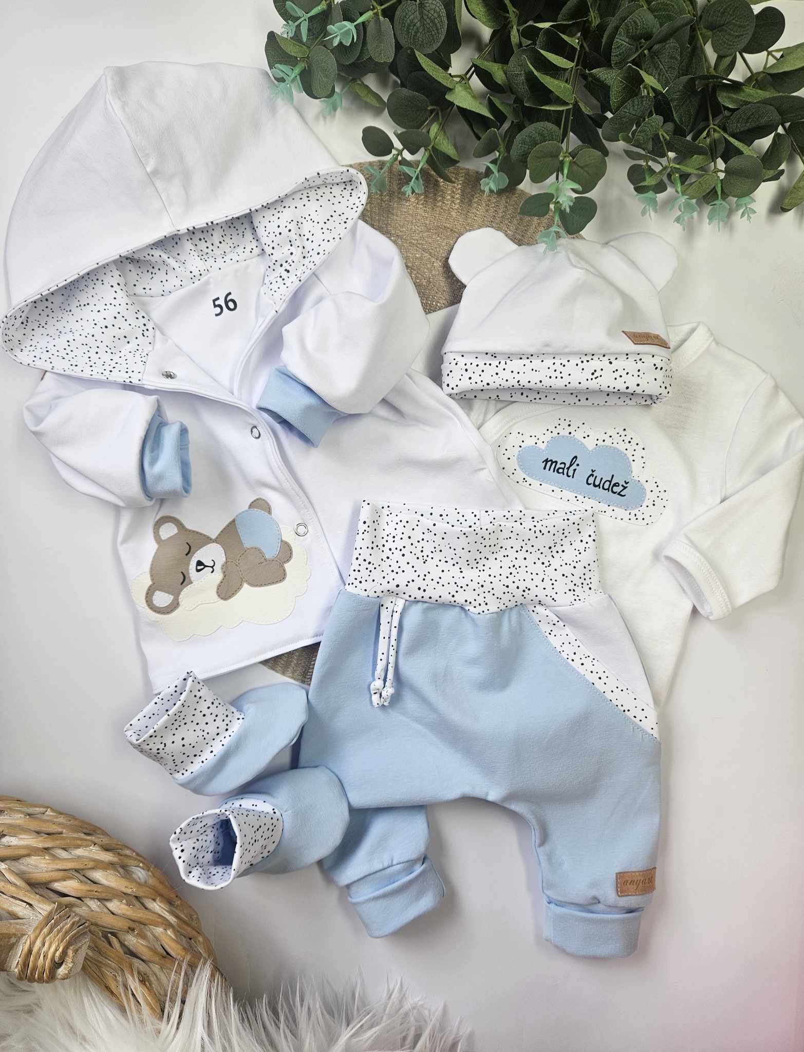 Komplet vsebuje dvoslojno jopico s kapuco in ročno izdelano aplikacijo, bodi (na preklop do št. 68) z ročno izdelano aplikacijo in napisom, mehke baggy hlačke s podaljšanimi patenti, kapico z ušeski, ter copatke.