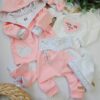 Komplet vsebuje bodi (na preklop do št. 68) z ročno izdelano aplikacijo, baggy hlačke s podaljšanimi patenti za daljše nošenje, ter kapico z vozli.
