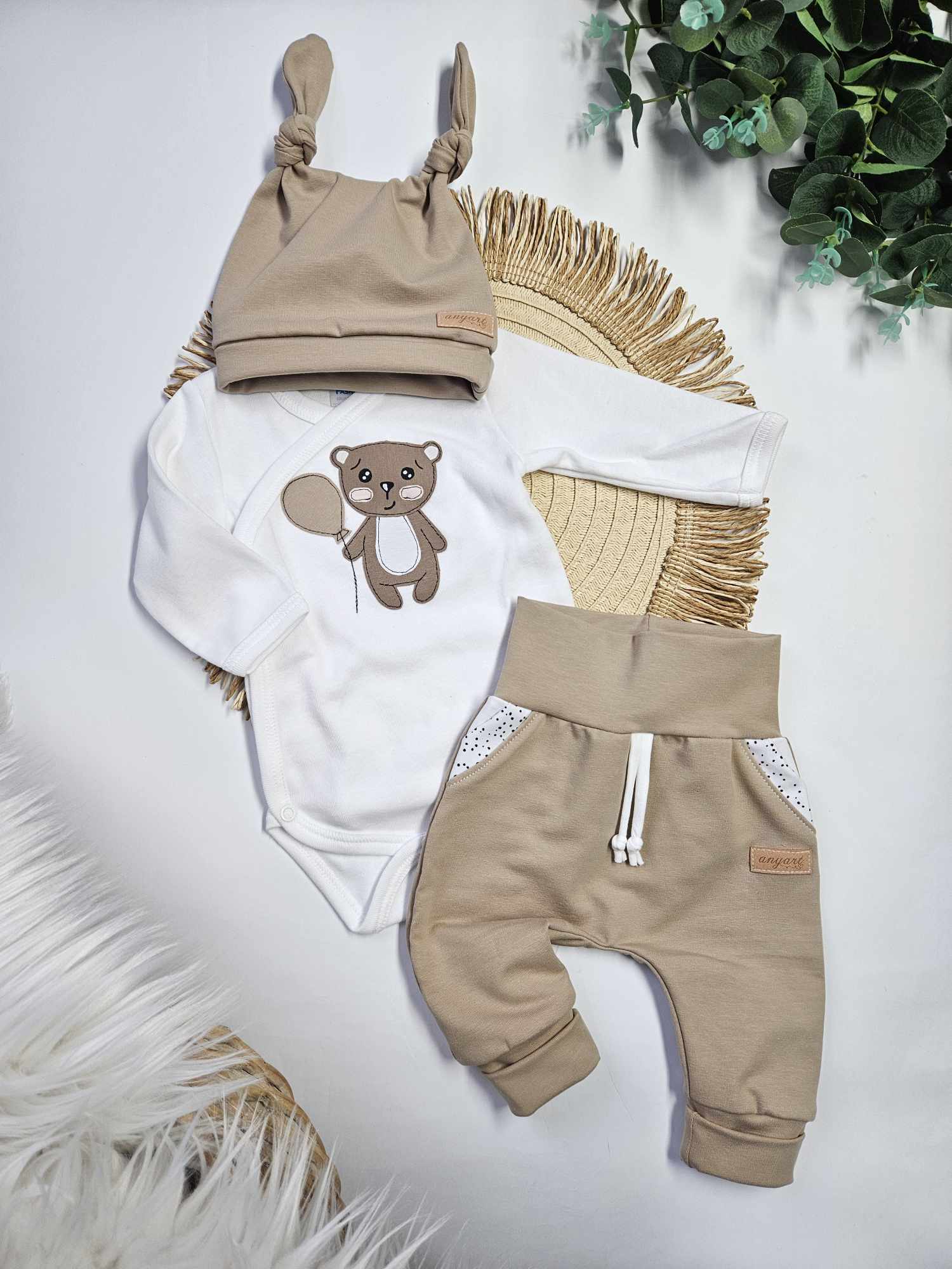 Komplet vsebuje bodi (na preklop do št. 68) z ročno izdelano aplikacijo, baggy hlačke s podaljšanimi patenti za daljše nošenje, ter kapico z vozli.