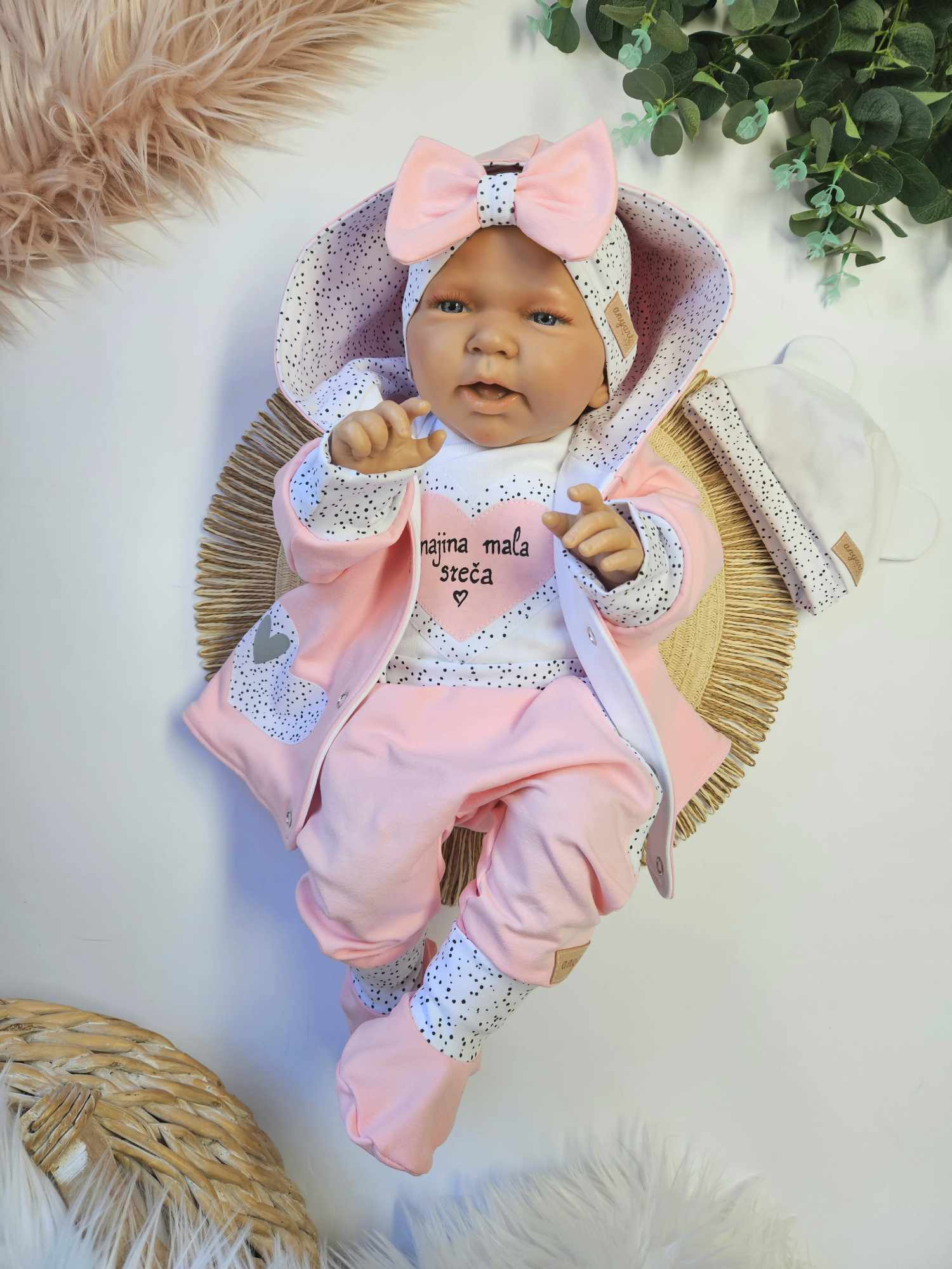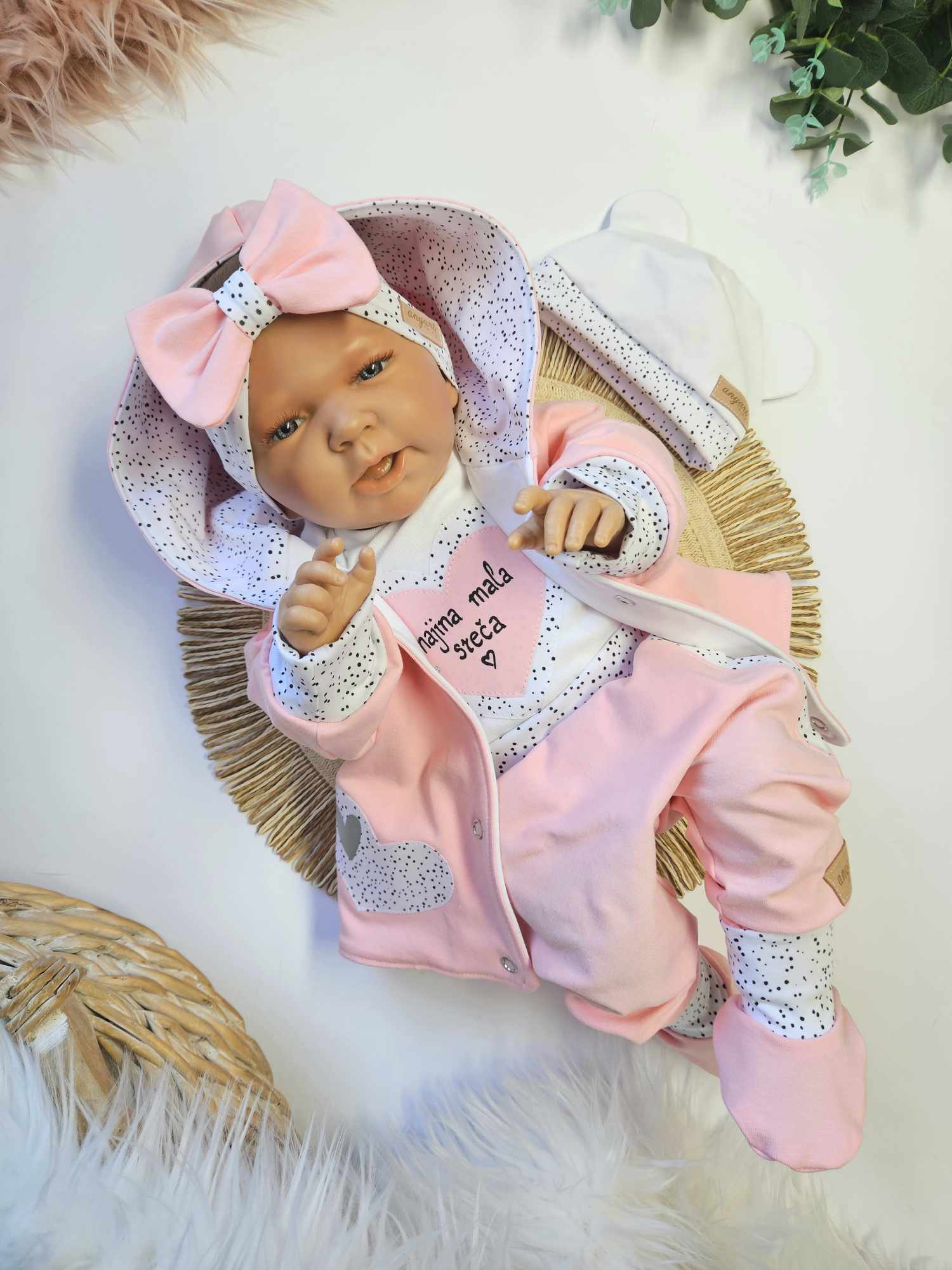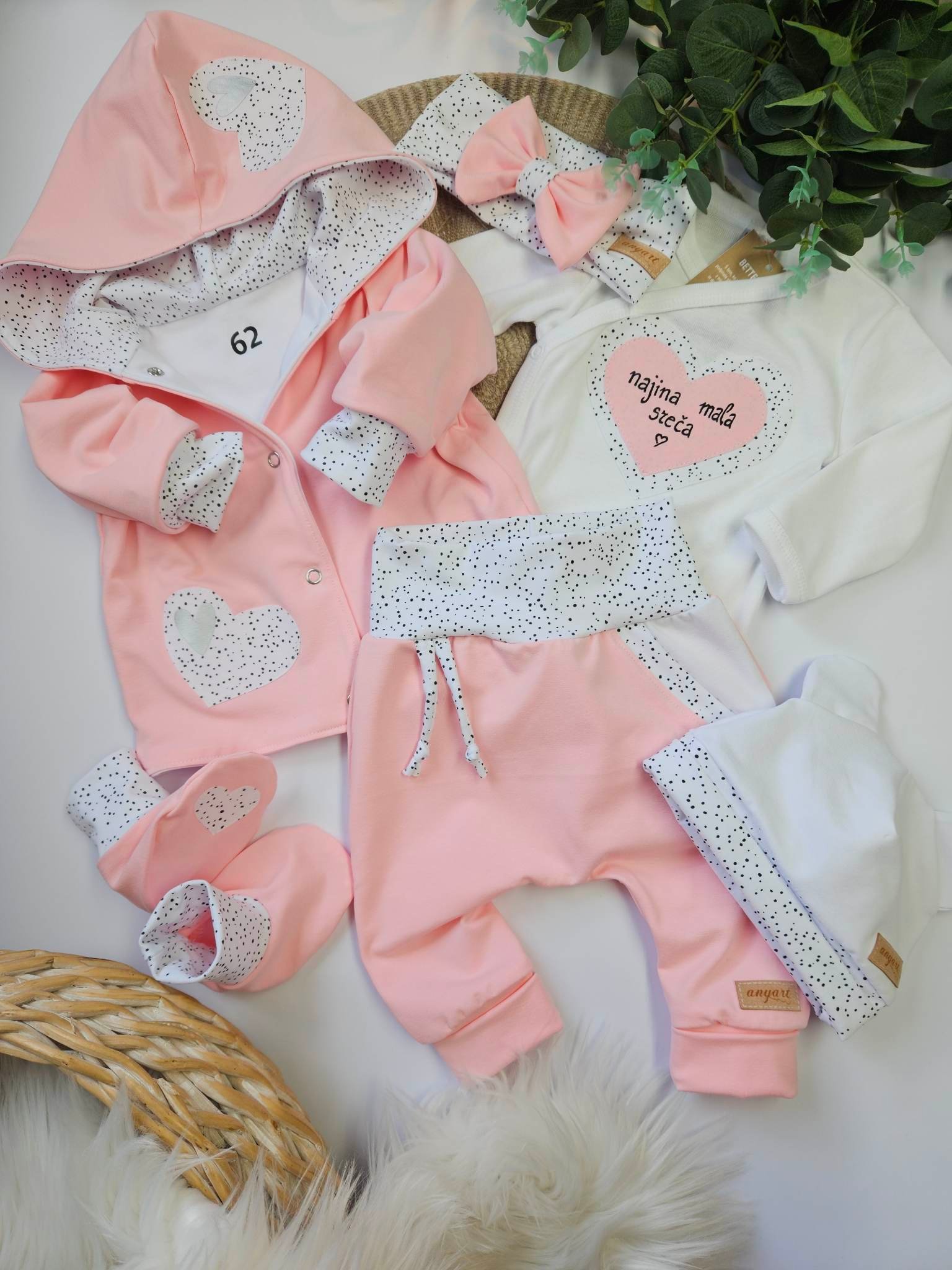 Komplet vsebuje dvoslojno jopico s kapuco in z ročno izdelano aplikacijo, bodi (na preklop do št. 68) z aplikacijo in ročno narisanim napisom, baggy hlačke s podaljšanimi patenti, kapico z ušeski, trakec z mašnjico, copatke.