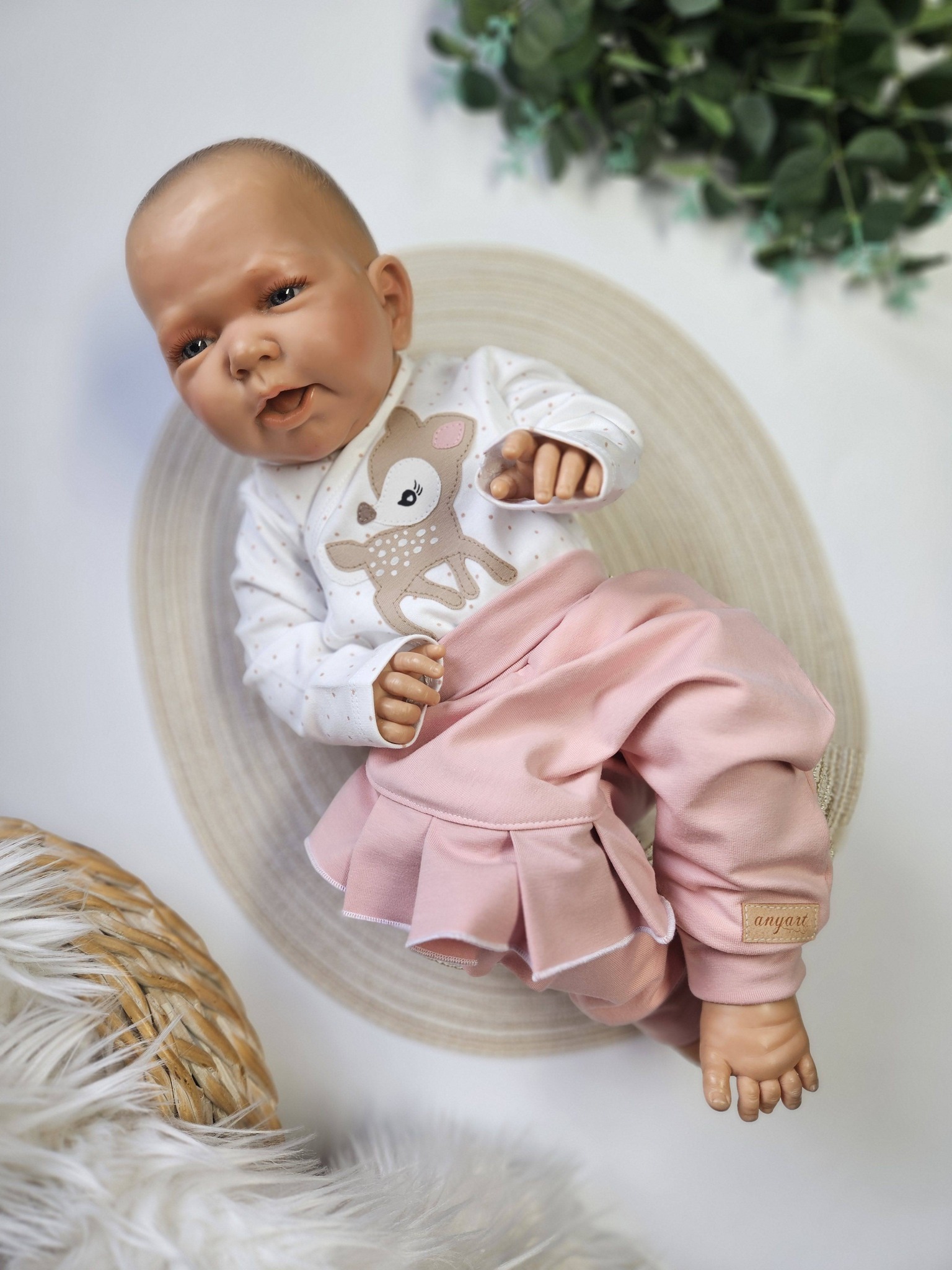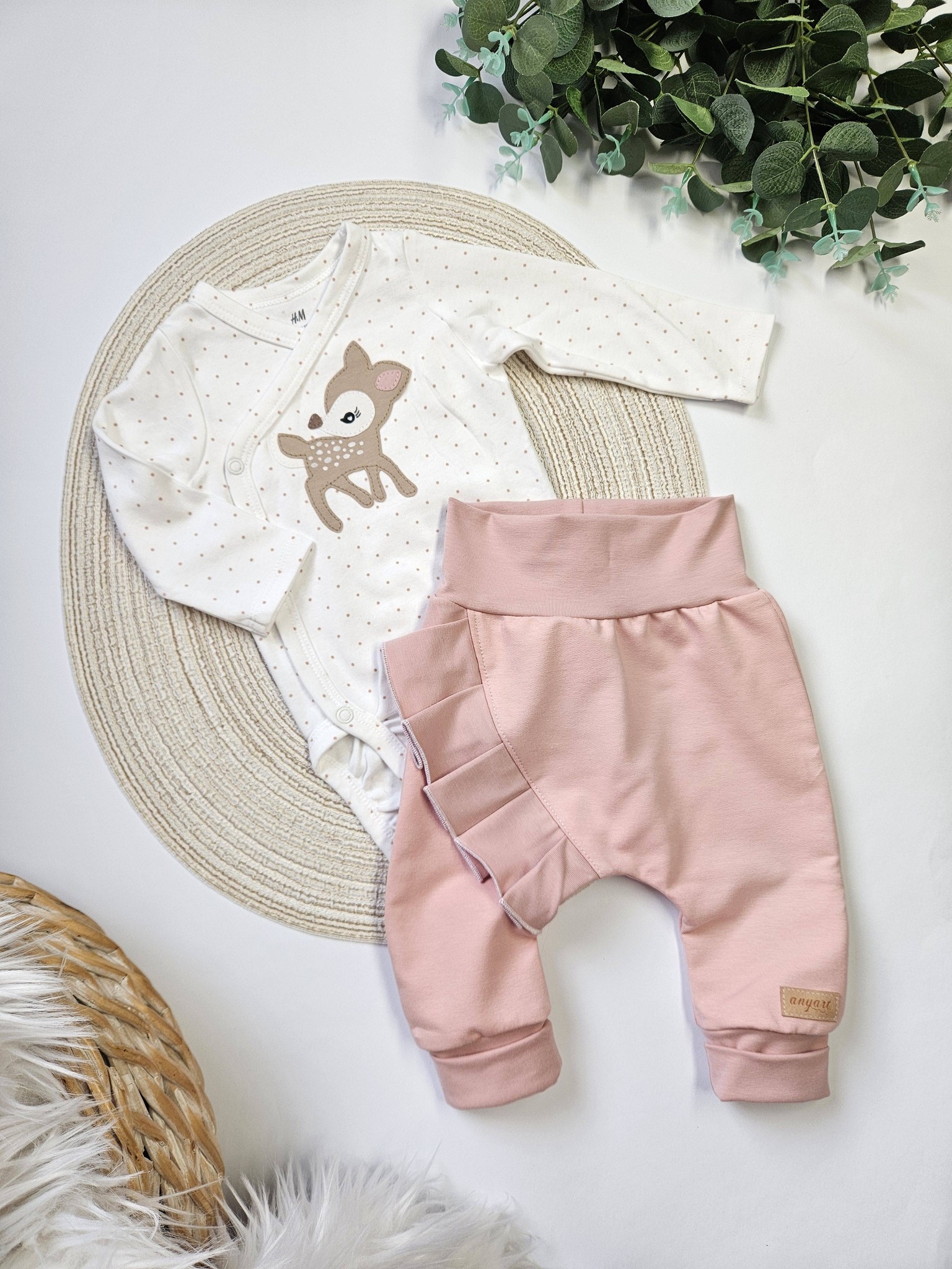 Komplet velikosti 62; vsebuje bodi na preklop z ročno izdelano aplikacijo, ter udobne baggy hlačke z volančkom in podaljšanimi patenti za daljše nošenje.