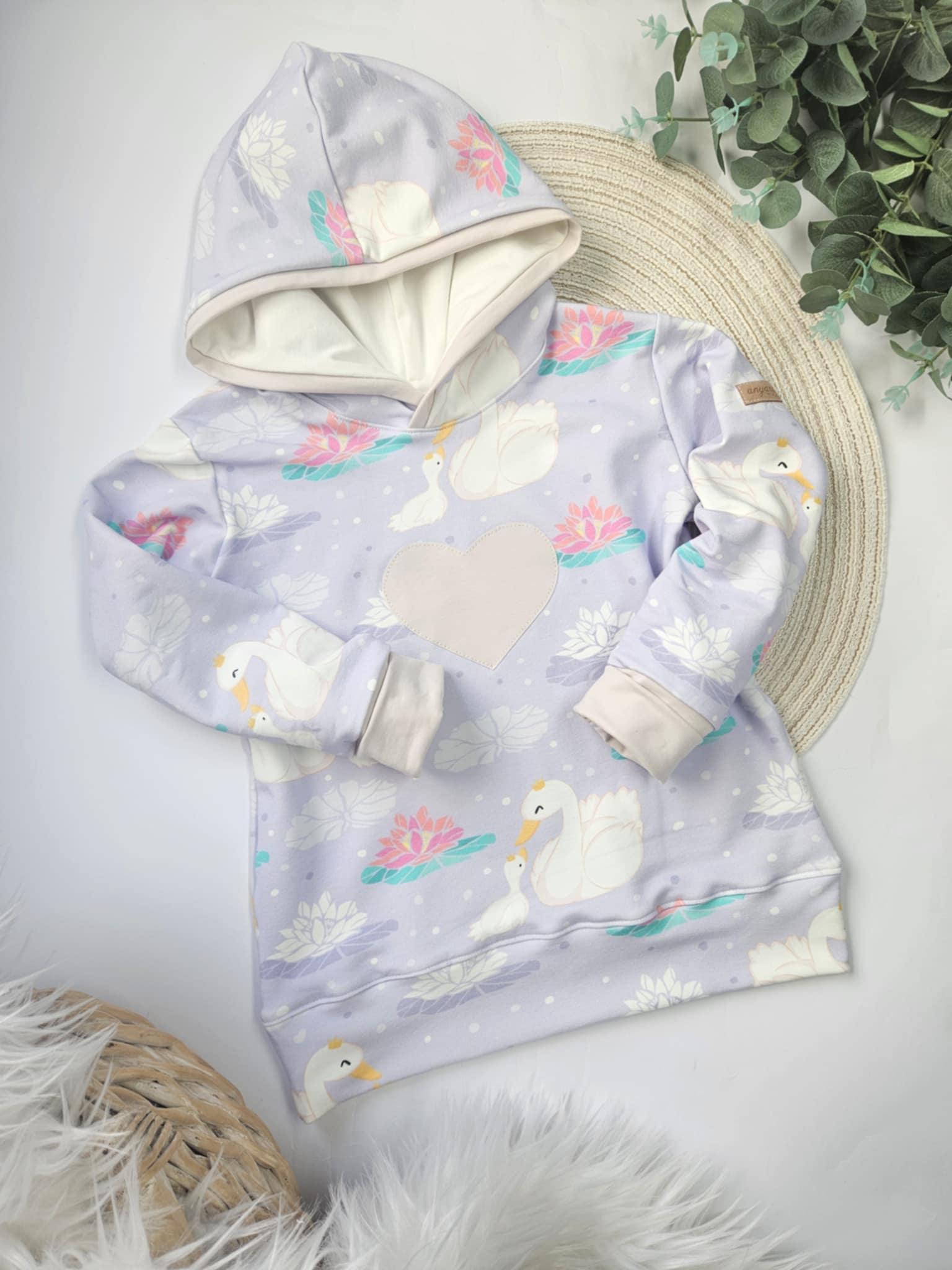 Komplet velikosti 56; vsebuje dvoslojno jopico s kapuco in ročno izdelano aplikacijo, udobne baggy hlačke, nastavljivo rutko/slinček, navadno kapico in copatke.