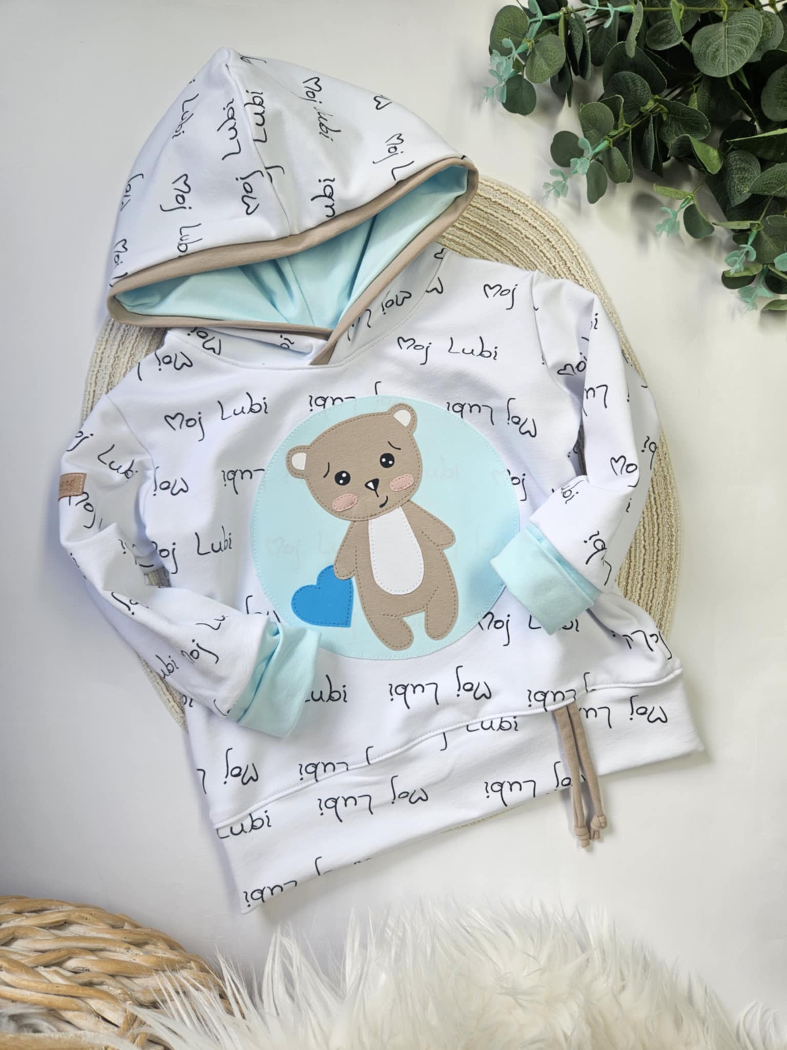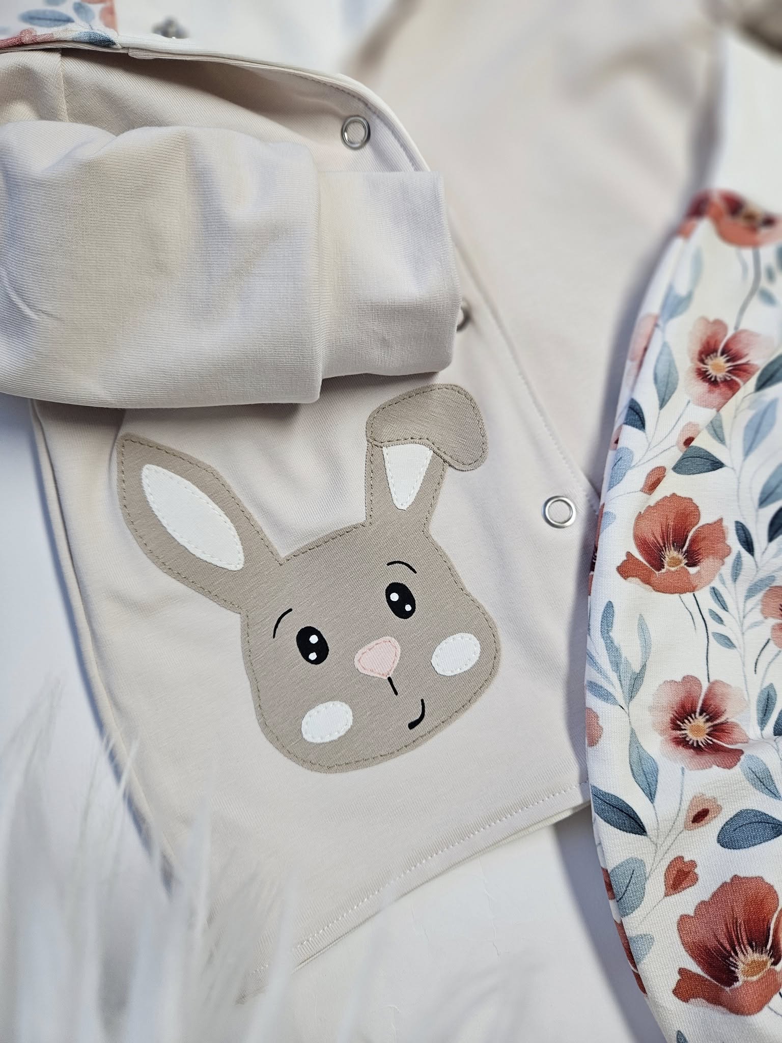 Komplet velikosti 74; vsebuje dvoslojno jopico s kapuco in ročno izdelano aplikacijo, mehke baggy hlačke s podaljšanimi patenti za daljše nošenje ter trakec z mašnico.