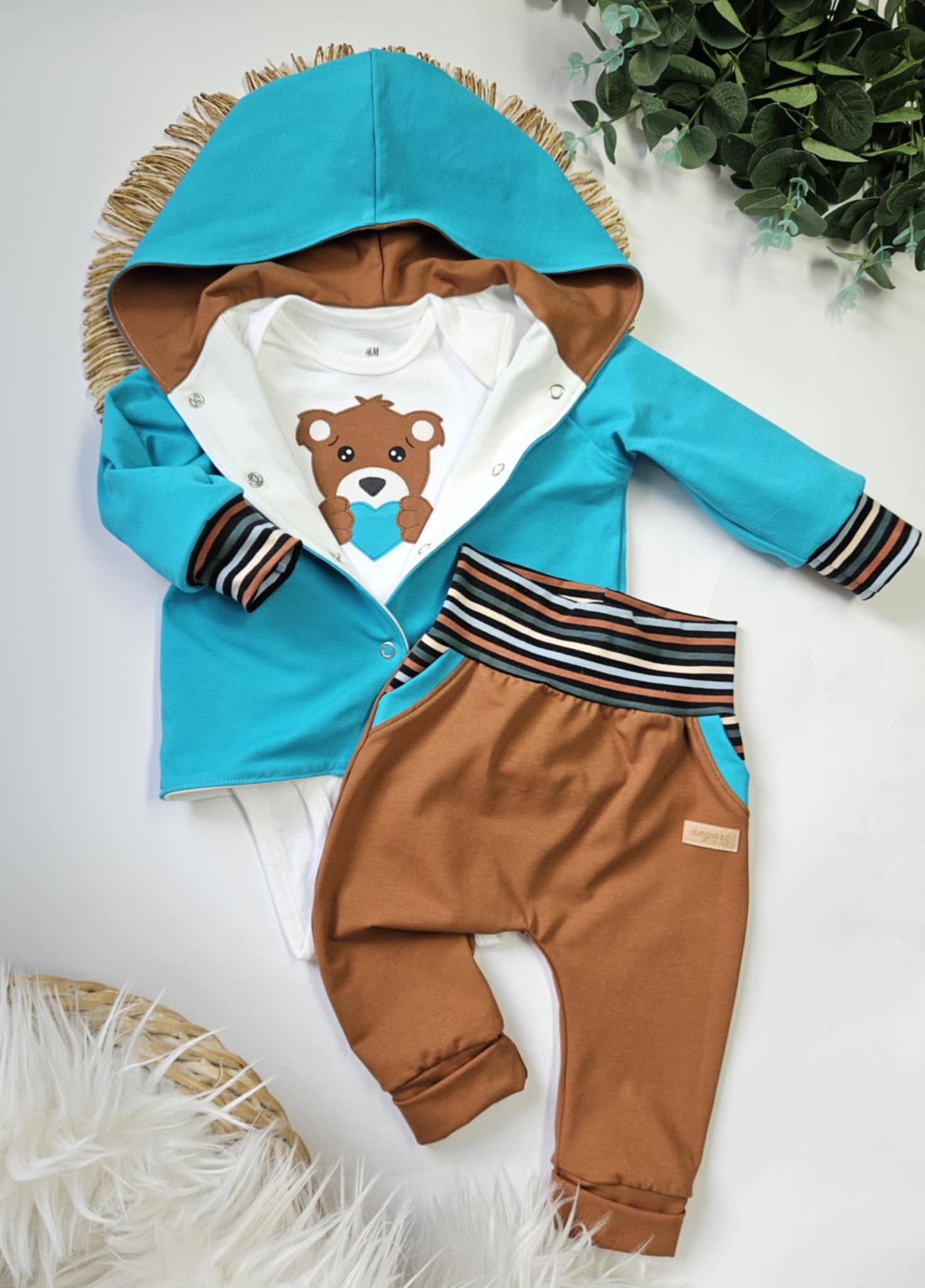 Komplet velikosti 74; vsebuje dvoslojno jopico s kapuco in večjo ročno izdelano aplikacijo na zadnjem delu; bodi z ročno izdelano aplikacijo, ter tanjše baggy hlačke s podaljšanimi patenti za daljše nošenje.