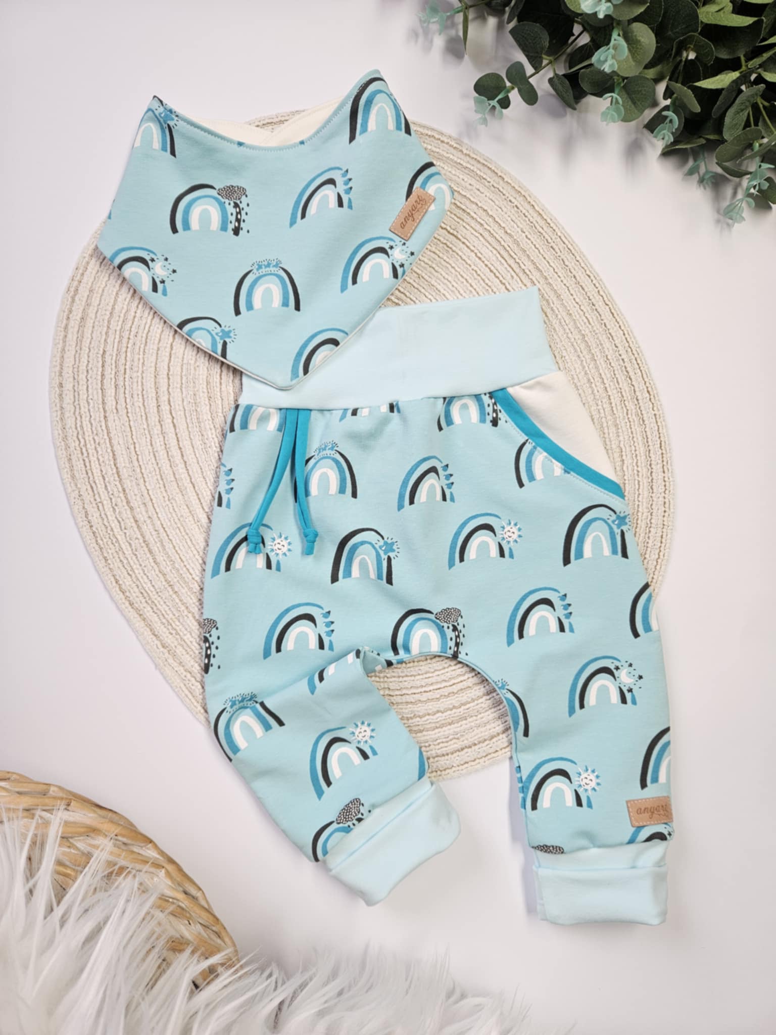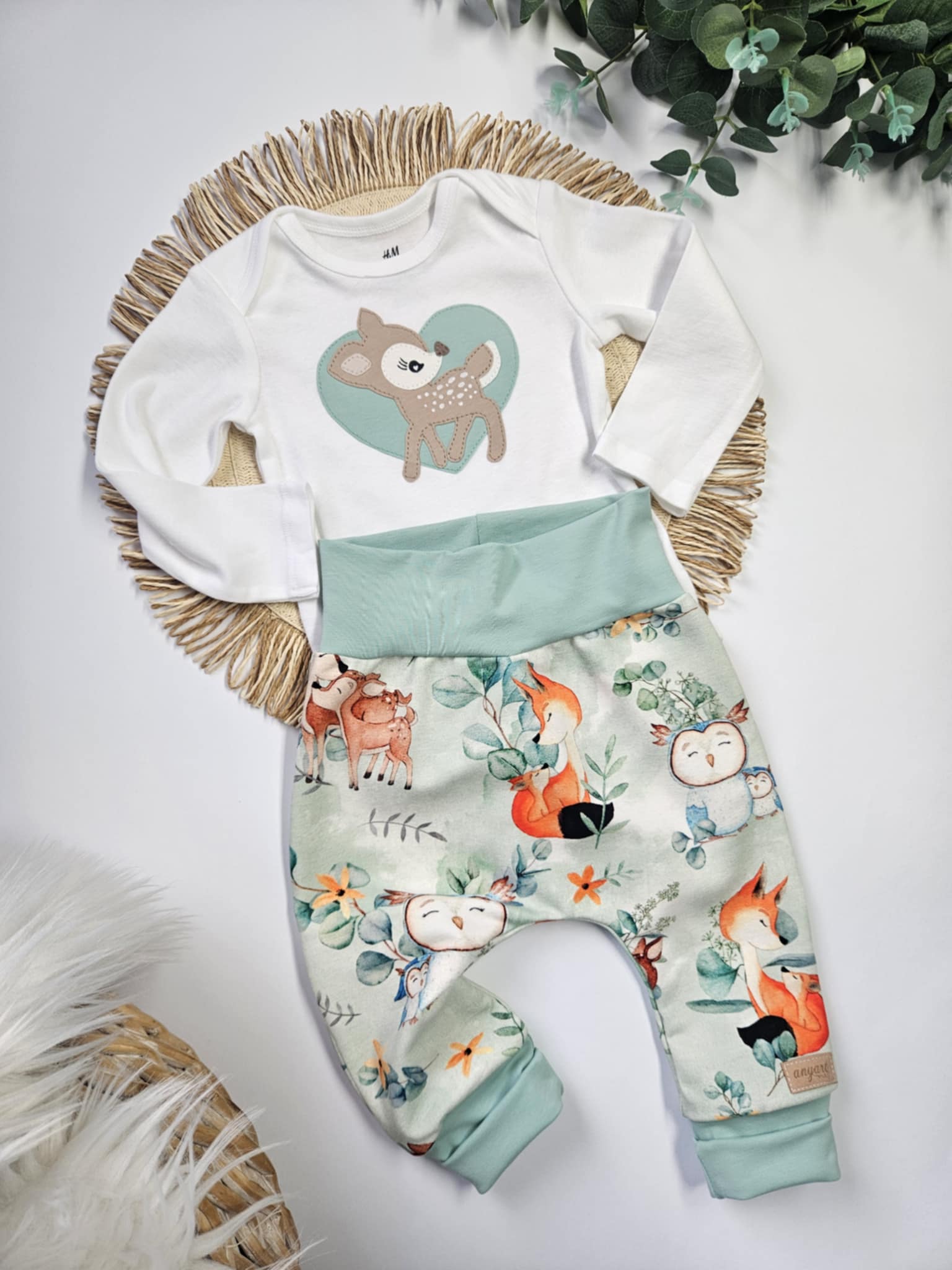 Komplet velikosti 68; vsebuje bodi z ročno izdelano in poslikano aplikacijo, ter udobne baggy hlačke s podaljšanimi patenti za daljše nošenje.