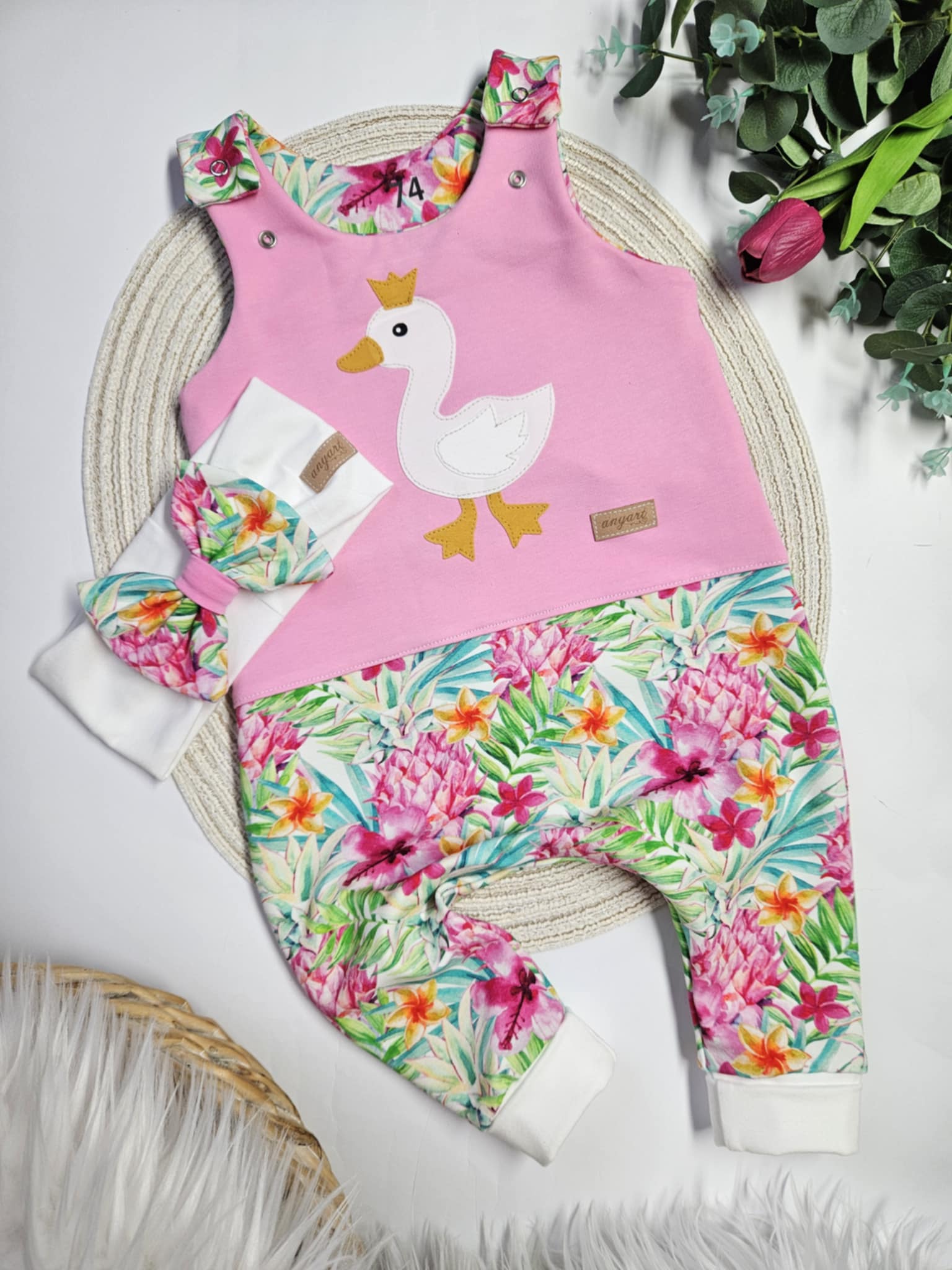 Komplet velikosti 62; vsebuje dvoslojno jopico s kapuco in z ročno izdelano aplikacijo ter mehke pliš baggy hlačke s podaljšanimi patenti za daljše nošenje.